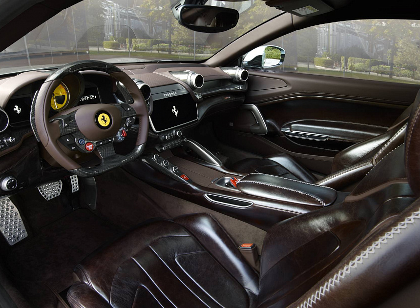 Новое решение дизайна салона представляет собой пару арок, идущих вдоль автомобиля от передней стойки до заднего спойлера. Пространство задней арки было выбрано для создания аэродинамического канала с выпускной трубой, скрытой черной задней панелью под спойлером. Этот современный взгляд на тему «контрфорсной арки» Ferrari является прямой отсылкой к фирменному стилю Гарцующей Лошади, воплощенном не только в Ferrari GT, но и в спортивных автомобилях, таких как 599 GTB Fiorano. Чтобы салон выглядел более светлым, черный окрас крыши визуально соединяет ветровое стекло с задним стеклом, возвышающимся над поверхностью двери багажника, будто воздушный канал.