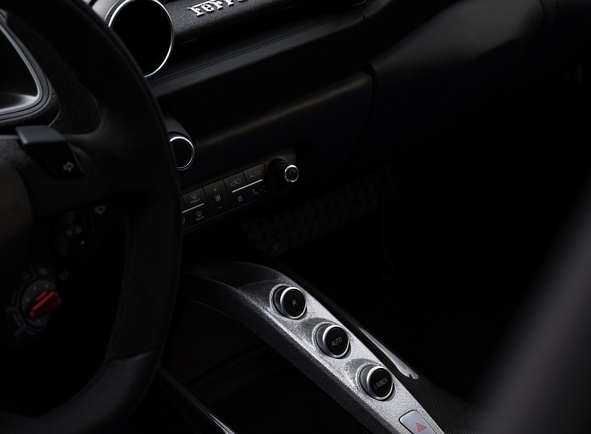 Каждая деталь интерьера является отсылкой к богатому гоночному наследию Ferrari. Внутреннее пространство выполнено с использованием алюминия и углеволокна. Салон оснащён спортивными сиденьями с комбинированной отделкой из синей кожи и джинсовой ткани Aunde и четырёхточечными ремнями безопасности. Вставки на передней панели и рулевом колесе с эффектом потрескавшейся краски, а также дверные ручки «под кованый металл» созданы по мотивам классических моделей 250 LM и 250 GTO.